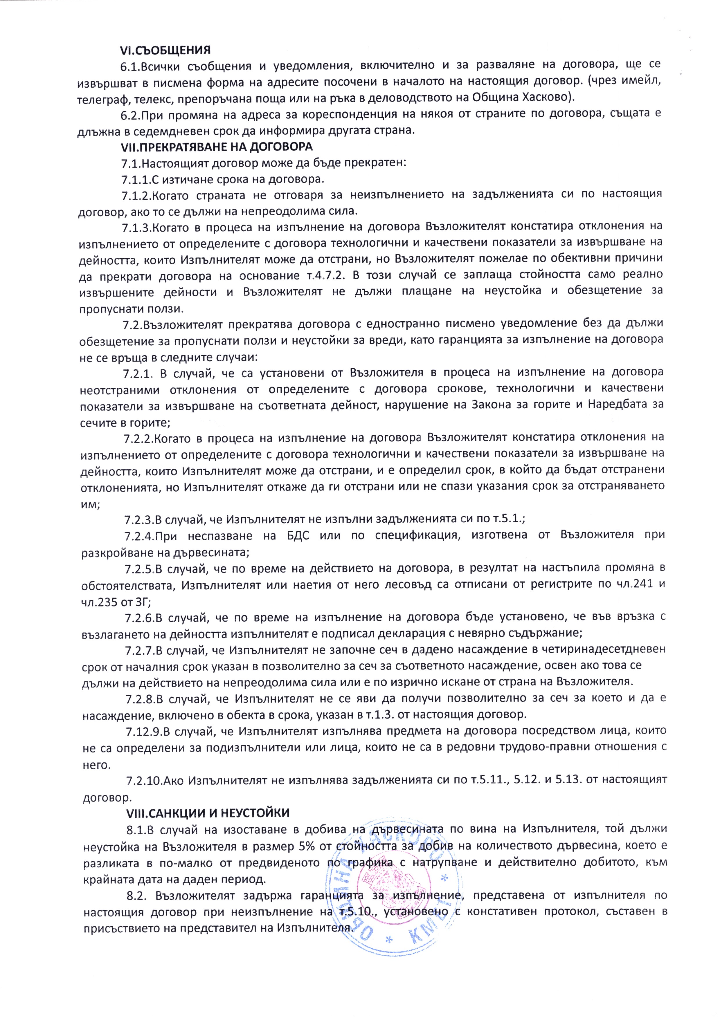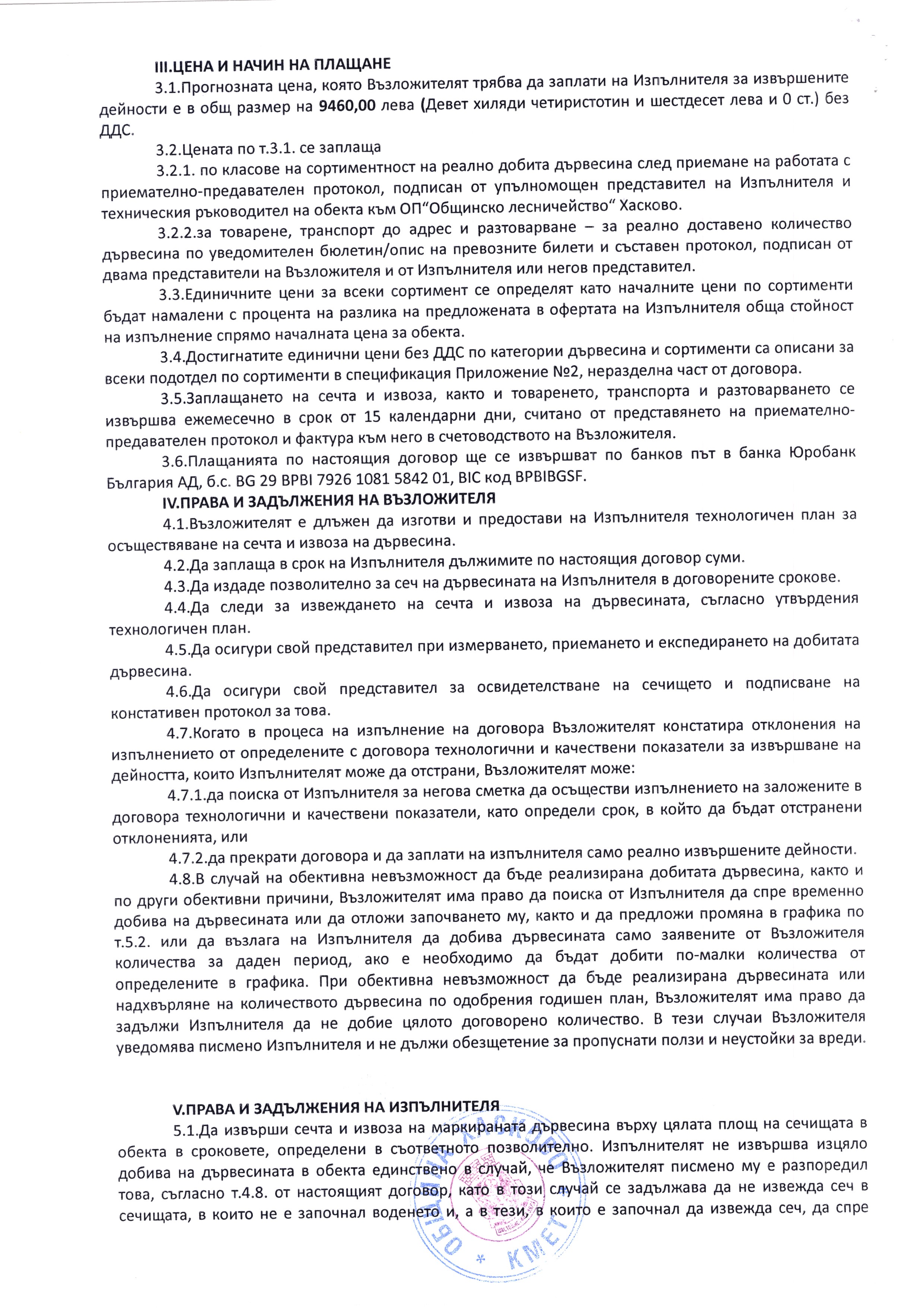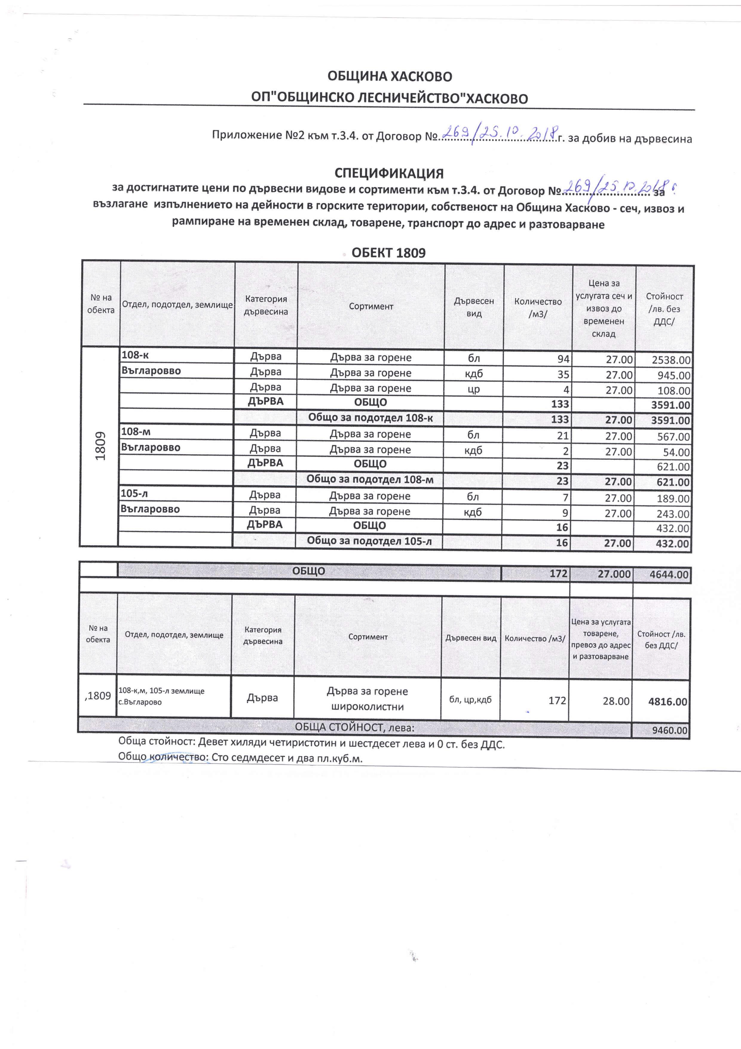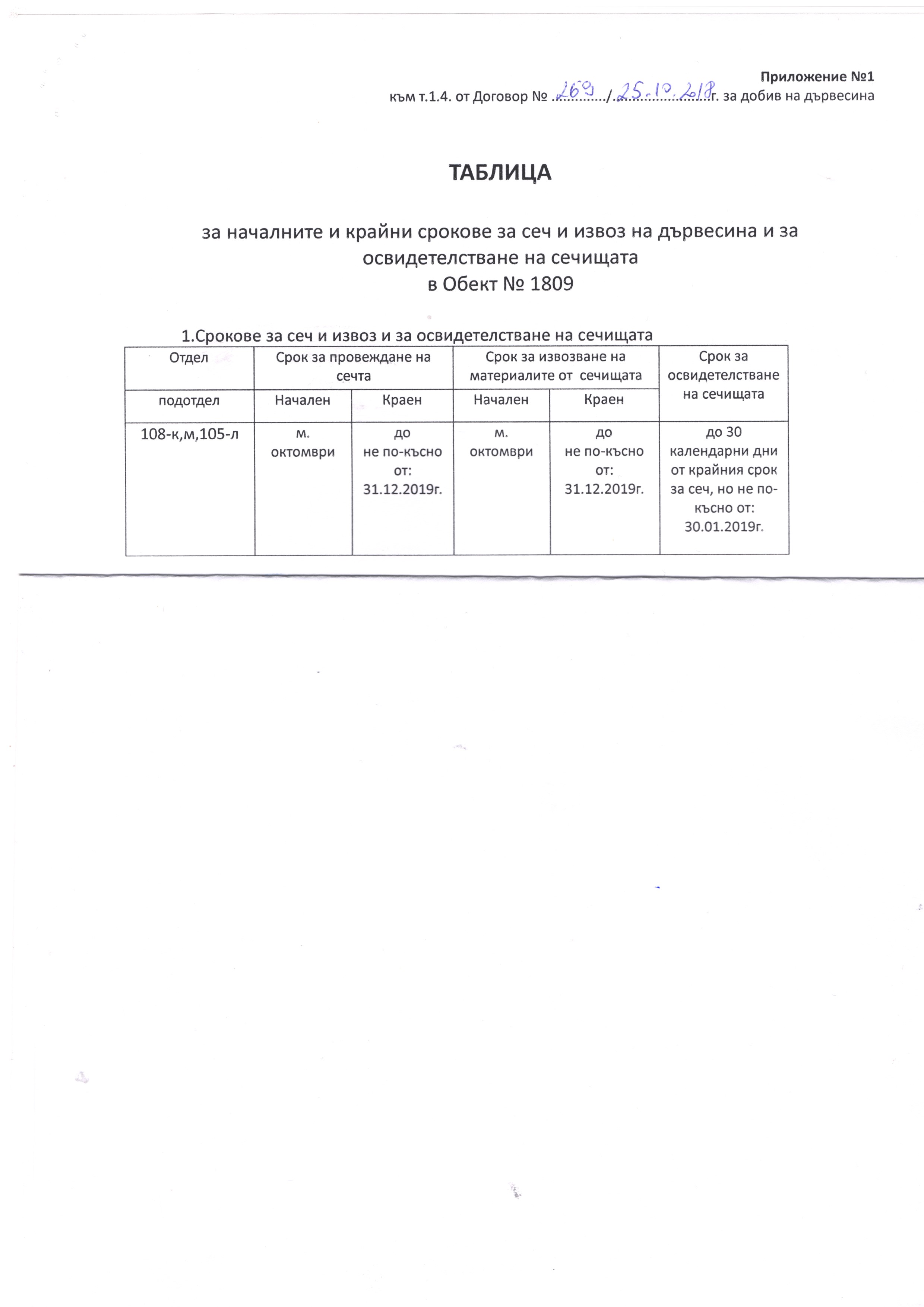 Договор №269/25.10.2018г. за възлагане добив на дървесина и товарене, транспортиране и разтоварване за Обект № 1809.